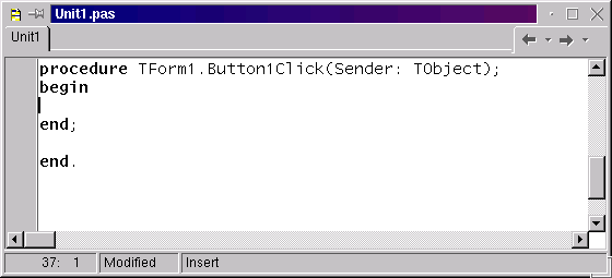 We will start with the timeless Hello World program, and then move onto something a little more challenging. Place a button component on the Form Designer, and use the Object Inspector (on its Properties page) to set its Caption property to: Hello World. Now switch to the Object Inspector's Events page and locate the OnClick event, which is fired when the button is pressed (i.e. clicked). Double-click in the right column (or select the event and press Ctrl+Enter) to create an event handler for the event. On the blank line between the begin and end enter this statement:
