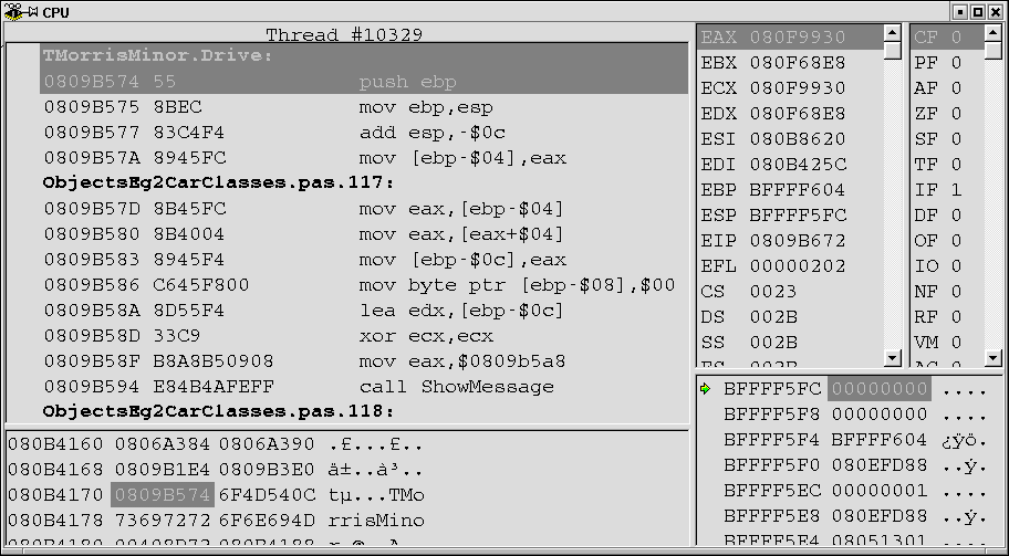 Figure 3 shows the TMorrisMinor VMT on display in the memory dump pane (bottom left). The addresses of the five methods shown in the VMT illustration in Figure 2 are listed (they begin at address $80B4160). The selected VMT entry (address $809B574) is for the fifth virtual method, TMorrisMinor.Drive. You can see a disassembly of this method in the disassembly pane (the largest pane).
