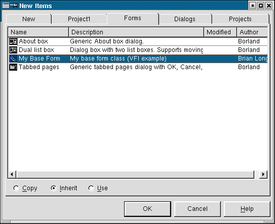 Note that this technique of VFI is worth experimenting with. A really nice effect occurs if you have the base class and the descendant class open in the IDE at the same time. If you make a modification to something in the base form (for example moving a component) the descendant form immediately reflects the change; the IDE ensures that the descendant form reflects any alterations in its ancestor.