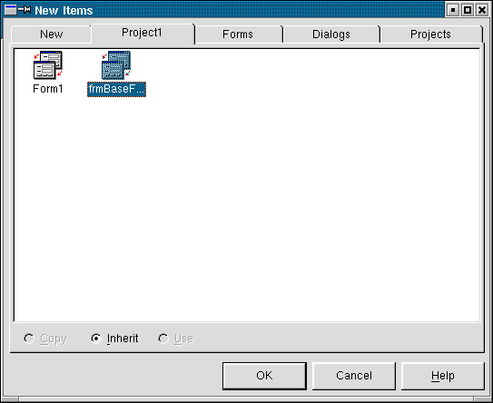 If you don't need to make a form available across multiple projects you can still visually inherit from a form in the current project without explicitly adding it to the Object Repository. As you can see in the various screenshots of the Object Repository dialog, the page immediately after New is a page dedicated to the current project (Project1 in all case so far). This page contains icons for each form and data module in the project and allows you to inherit from them (see Figure 10).