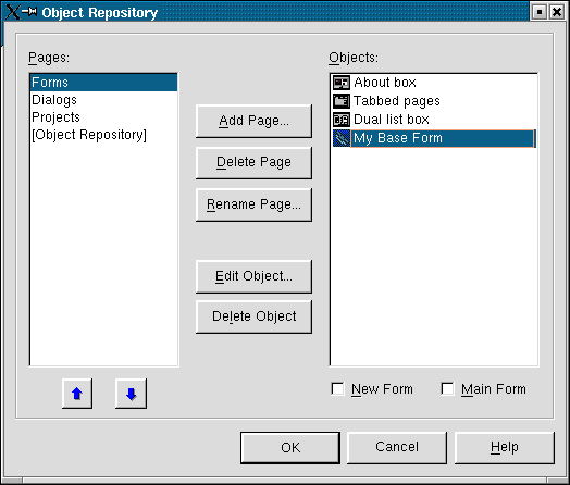 If the form is to be inherited from in multiple projects then we need to design the form and install it in the Object Repository. The Object Repository is a mechanism that allows you to store forms, dialogs, data modules (more appropriate in the commercial versions of Kylix) and projects to be re-used at later points. When you choose File | New... in Kylix you are presented with a dialog (Figure 5). The default page, New, contains wizards for creating components, shared objects, units, applications and so on. The Forms, Dialogs and Projects pages contain the items stored in the Object Repository.
