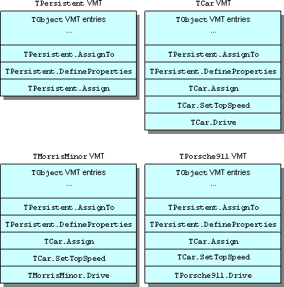You can see the layout of the VMTs for our three classes and their immediate ancestor in Figure 2. The first one shows TPersistent, which defines three virtual methods (AssignTo, DefineProperties and Assign). TCar overrides the Assign method and introduces two new virtual methods (SetTopSpeed and Drive). TMorrisMinor and TPorsche911 override the Drive method but add no new virtual methods, so their VMT size is the same as that of TCar.