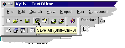 The files that make up a Kylix project are described in the Kylix Project Files section. To save your project, choose File | Save All (or choose the corresponding toolbutton, visible in Figure 2). This will prompt you first for a name for the form unit (the one supplied is called TextEditorU.pas) and then for the project file itself (called TextEditor.dpr in the supplied files).