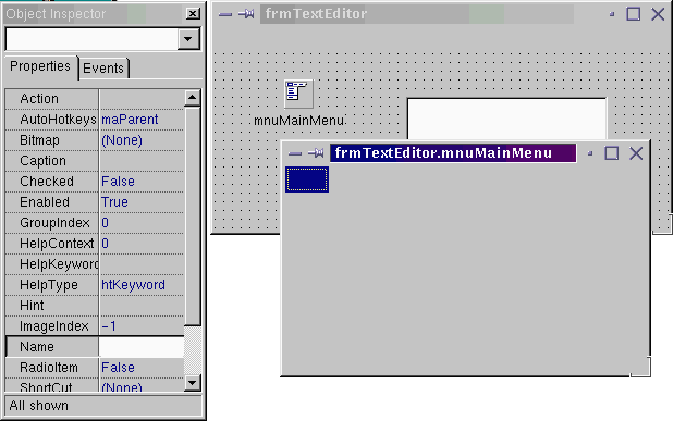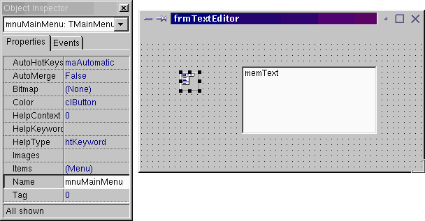 The form object is currently called Form1 (and is of type TForm1), which is not a very descriptive name. Change its name (using the Name property on the Object Inspector) to frmTextEditor, remembering to press Enter after typing the new Name to ensure it is applied to the property. You should try and remember to press Enter after typing in any new property in Kylix 1 as otherwise there is a risk that the property value will be ignored.
