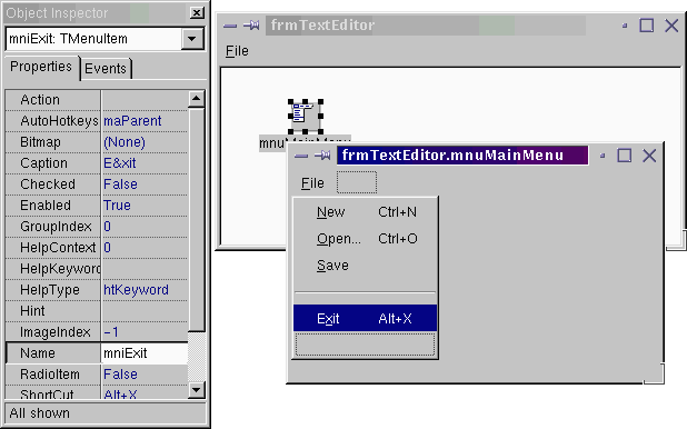 Let's take the easy ones first, File | Exit and Help | About..., so make OnClick event handlers for both of them. The first one needs to terminate the application. All CLX applications have a main form (by default the first form in the project) and when that form is closed the whole application terminates (as opposed to just that form closing). We can take advantage of this by calling the main form's Close method, which will in turn close the program. The only form in this project (and which, therefore, is the main form) is frmTextEditor. So to close the application, the menu item event handler could call: