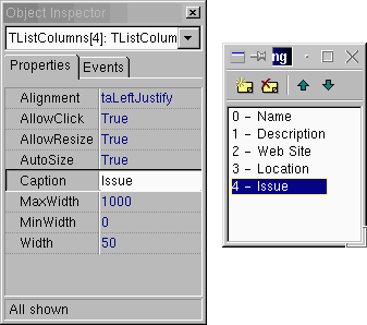 The column order in the program is: Name, Description, Web Site, Location and Issue (note that this differs from the order in the CSV file). To ensure a nice display set the AutoSize property of the Name, Web Site and Location columns to True (but not that of the lengthy Description column) and the MaxWidth property of Description to $8000.