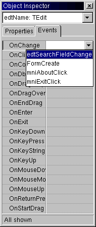 To set this up double-click the first edit control. This makes an OnChange handler called edtNameChange. To make this event handler look more like a shared event handler, use the Object Inspector's Events page to rename it to edtSearchFieldChange.