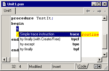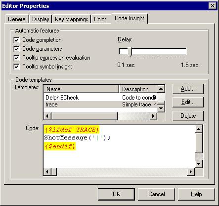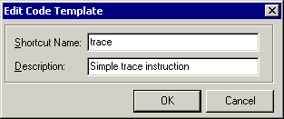 The apparent downside now is that you must enter three lines (or one quite long line if you like) for each trace instruction. This particular hurdle can also be removed by defining a new Code Template, dedicated to a trace instruction. The Code Insight page of the Tools | Editor Options... dialog allows you to add to the standard set of Code Templates with the Add... button.