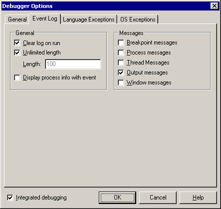 The Event Log, which was introduced in Delphi 4 can be accessed using View | Debug Windows | Event Log. You can customise it by right-clicking on it and choosing Properties or by going to the Event Log page of the debugger options dialog (Tools | Debugger Options...). My setup is shown in Figure 4 where you can see the Output messages option is checked, which ensures the text passed to OutputDebugString will be displayed.