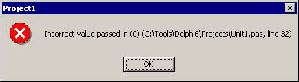 Listing 10 also shows the closest you can get to a similar effect using a normal condition and raising an exception. However, it is not the exact equivalent since assertions give you a little more information as you can see in Figure 9. Source file name and location and also line number information is provided, which is otherwise unavailable in a normal compiled Delphi application.