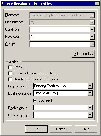 To set up these advanced properties, you need to get to the normal breakpoint properties and press the Advanced >> button to expand it. Breakpoint properties can be viewed by either right-clicking on a breakpoint symbol in the editor's gutter and choosing Breakpoint properties... or by right-clicking on the appropriate breakpoint in the Breakpoint window (View | Debug Windows | Breakpoints) and choosing Properties.