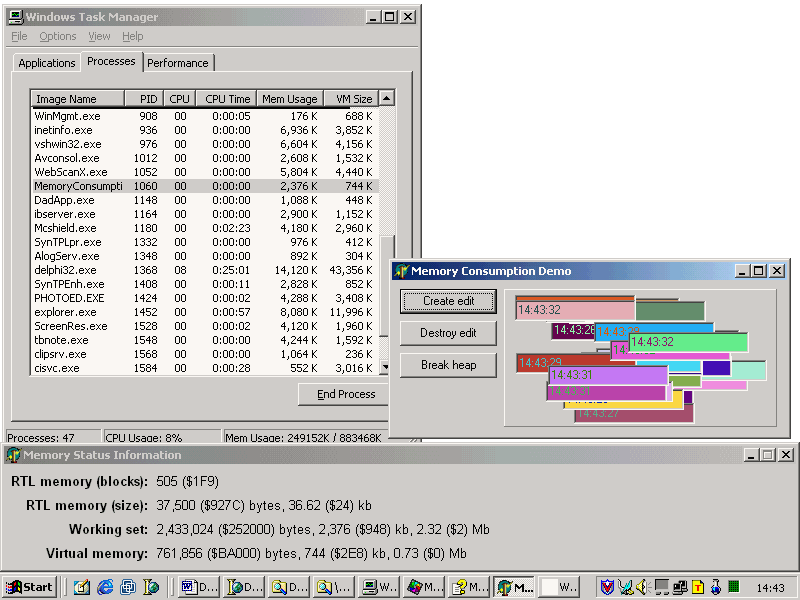 The example application can be seen running with the memory status form in Figure 19, where a number of edit controls have been dynamically created. The Task Manager reports Mem Usage of 2,376 kb and a VM size of 744 kb. These figures are echoed on the memory status form along with more values that are more accurate (measured in bytes) and also less accurate (measured in megabytes).