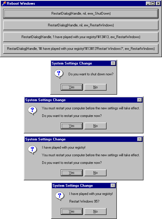 As Windows is closing down a wm_EndSession message is sent around to all top level windows. A message handler for this message can be used to write your program’s last will and testament into the registry before terminating. Listing 23, from the sample Delphi 2 (or later) project Restart.Dpr, contains a possible implementation.