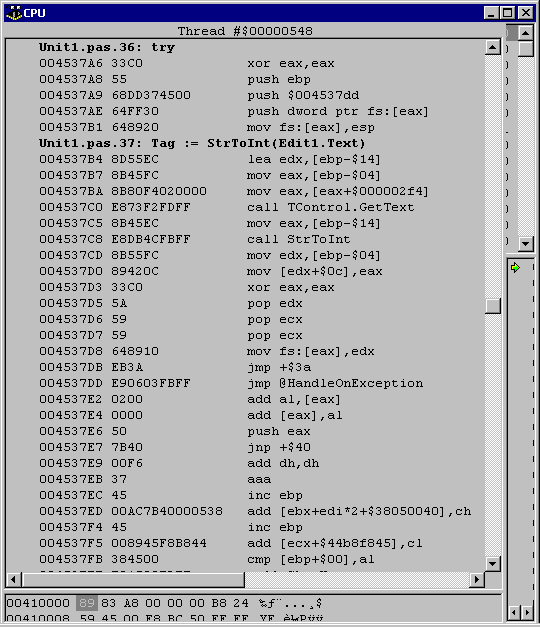 Despite being fully available in Delphi 4, 5 and 6, as well as in Kylix 1 (and the historically popular standalone Turbo Debugger), the CPU window is not very well understood and developers often shy away from it. This is unfortunate because, when used well, it can prove to be one of the most direct and powerful debugging aids for the developer.