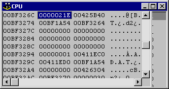 This will dump the memory starting four bytes before the address held in EAX, and so show the heap block prefix DWord, followed by the object's instance data. The first DWord of instance data will be the address of the VMT (the class reference). The memory dump pane will look like Figure 8. You can see it has a value of $21E.