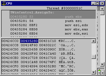 So, for example, this is how we can be taken to the implementation of the TButton destructor. Using the address we found before, press Ctrl+G in the memory dump pane, enter $426CC0 + vmtDestroy, press OK, then press Ctrl+E. The disassembly pane will then show the destructor (which for a VCL button is TWinControl.Destroy, and for a CLX button in Delphi or Kylix is TWidgetControl.Destroy).