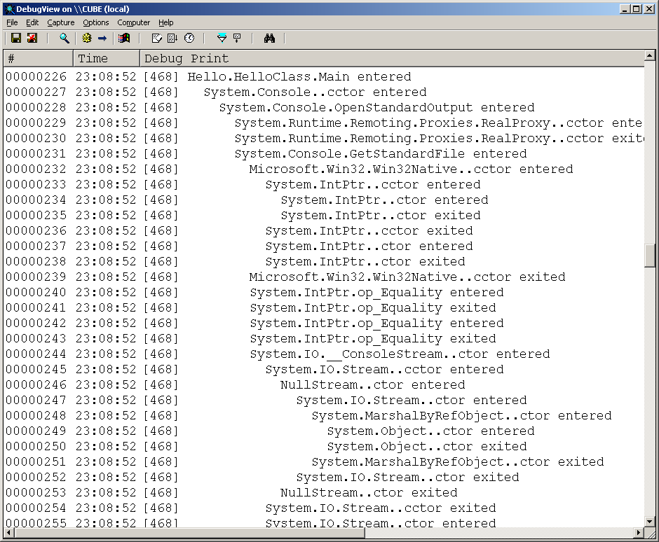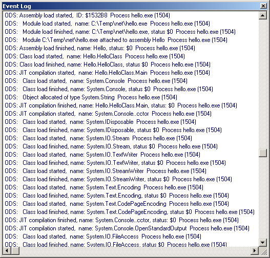 The methods also make use of a NestingLevel variable to try and indicate events that occur during some other operation. When, say, an assembly starts being loaded the nesting level is incremented (i.e. the output will be indented) and when the assembly stops loading the nesting level is decremented (unindented).