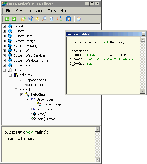 However as you might be able to see, there are additional facilities in Reflector over ildasm.exe, such as the lists of base types and descendant types, a list of dependencies for the assembly, the ability to search for types in an assembly and a call tree. Also, the disassembly window explains the IL instructions using tooltips when you pause your mouse over them. These all make Reflector a useful tool to have available.
