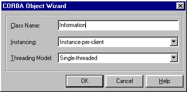 In the CORBA Object Wizard dialog, set the class name to Information, as this object will be able to supply a couple of pieces of information to its clients. Leave the Instancing: option set to Instance-per-client so that each client will get a new instance of the server object. Also, leave the Threading Model: option set to Single-threaded so we don't have to worry about thread conflicts.