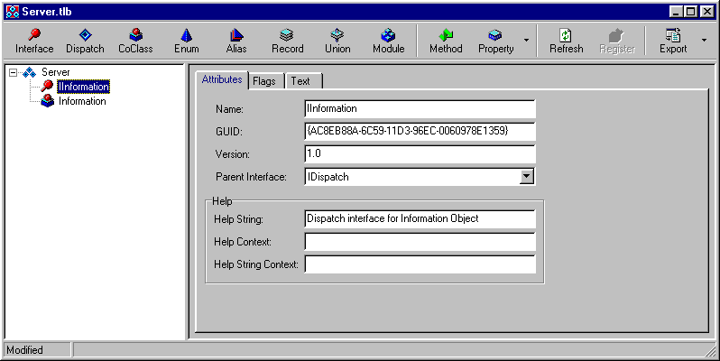 The type library editor can manufacture a suitable IDL file for this server. A suitable command-line for getting the IDL file into an Interface Repository using IREP.EXE was mentioned earlier and is: