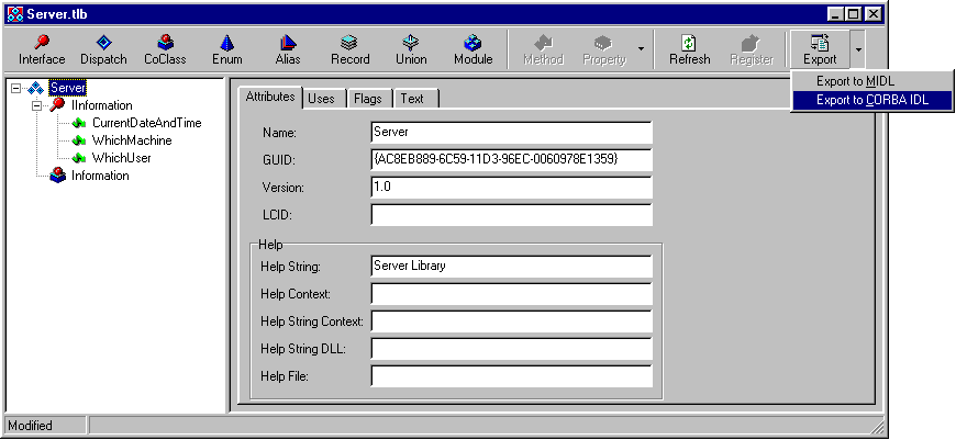 The Delphi type library editor can generate an IDL file in either of these IDL variants. To generate a CORBA IDL file, locate the Export tool button and press the arrow next to it. Be careful not to push the button itself, as this defaults to generating Microsoft IDL. The arrow creates a small menu where you can choose to create a CORBA IDL file.